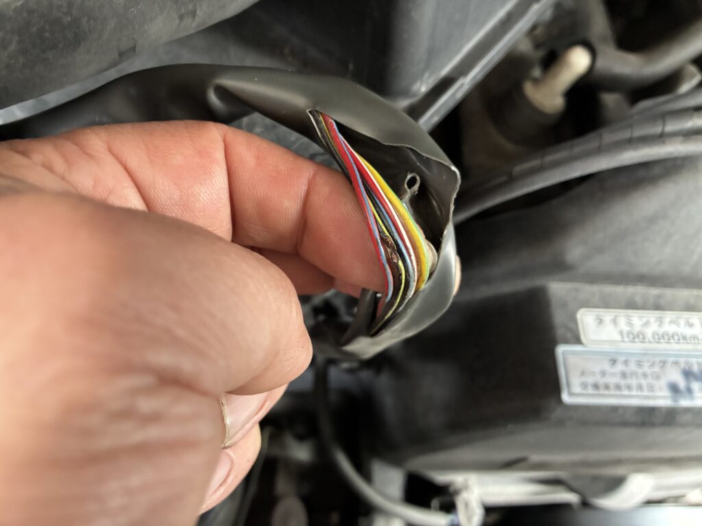 固定が外れ、エンジンの振動で被覆が削れて中の配線まで切れたみたいですね。