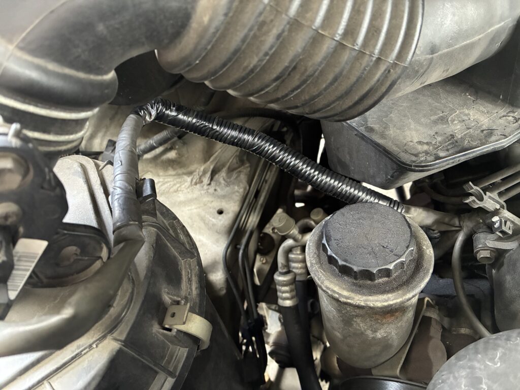 エンジンの振動で擦れて切れるという事にならないように配線に被覆を巻いて、一部を固定しているはずが