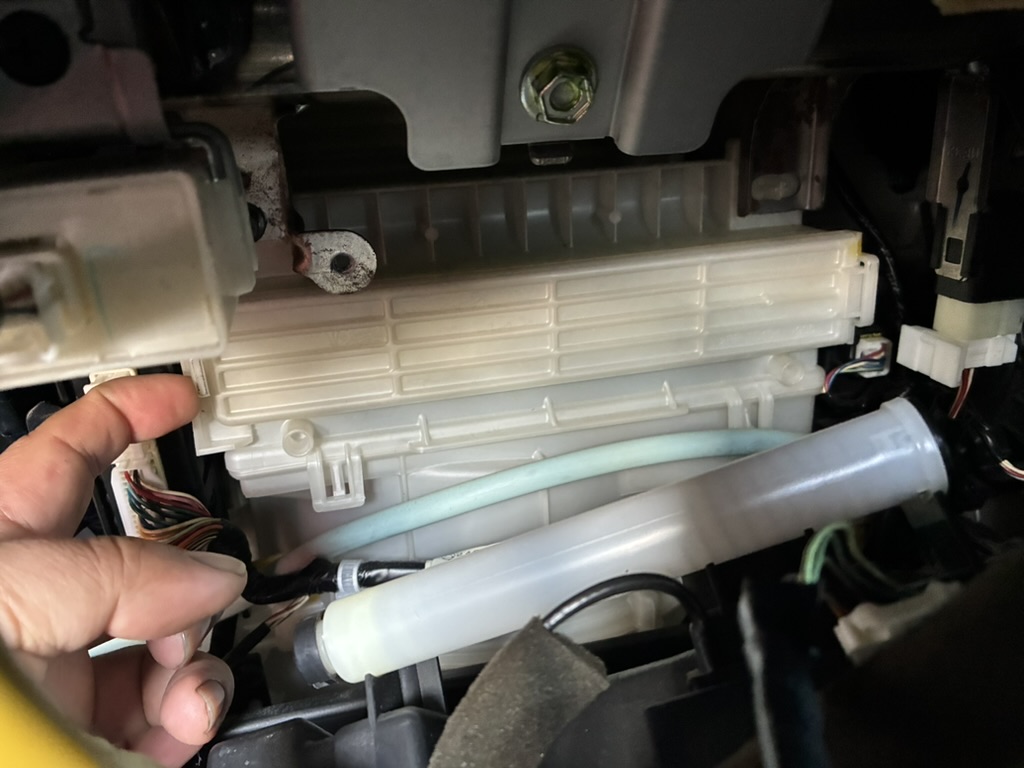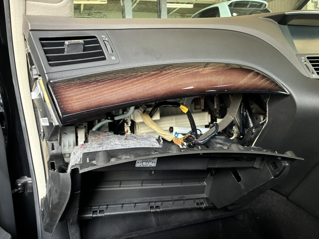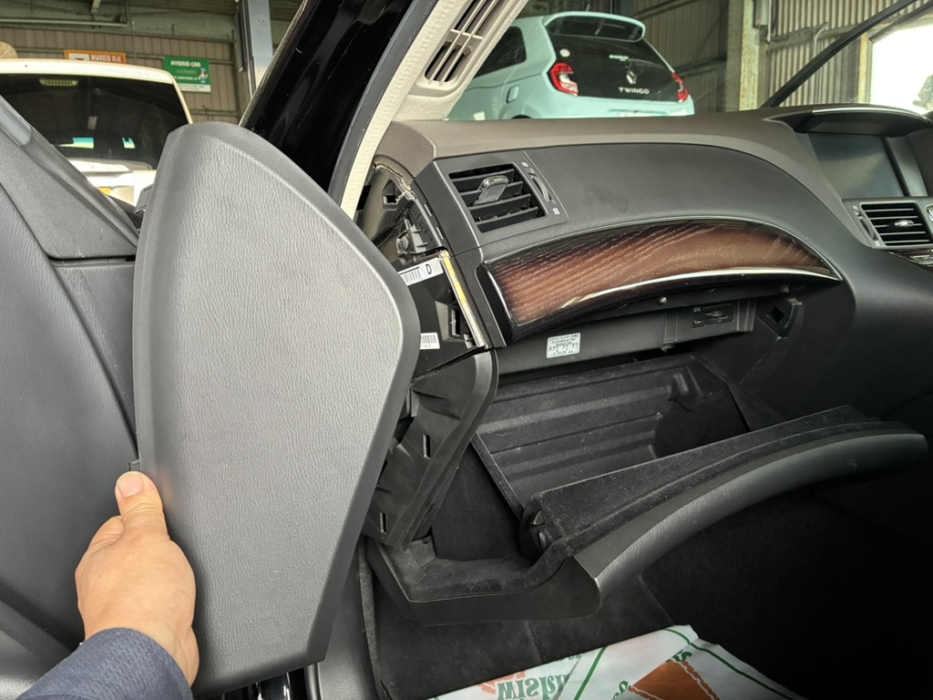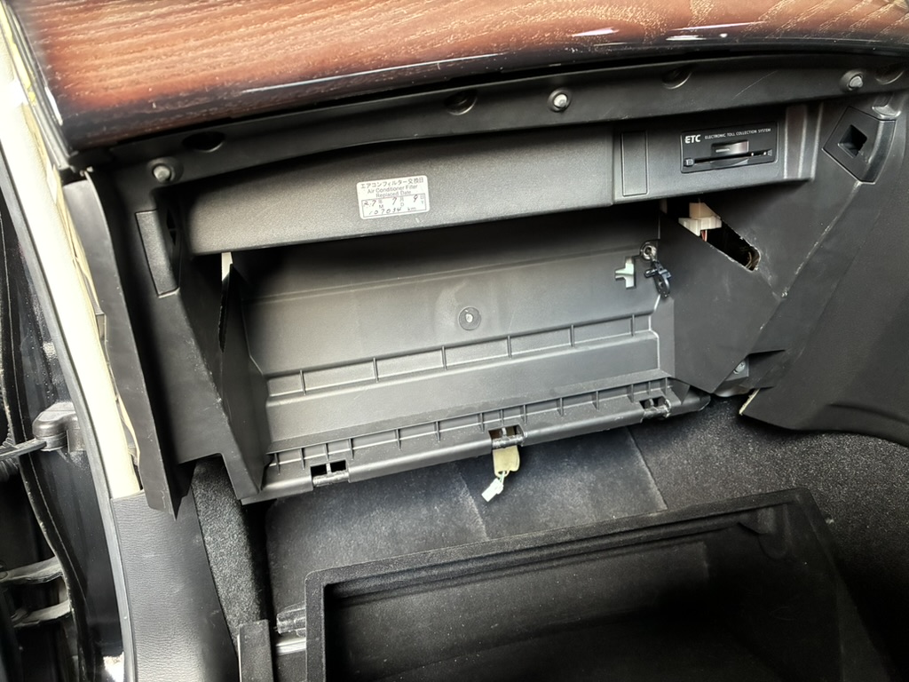 外れましたら、左右のフックはグローボックスをグイッと内側に縮めて外し手前に引き上げて外します。
